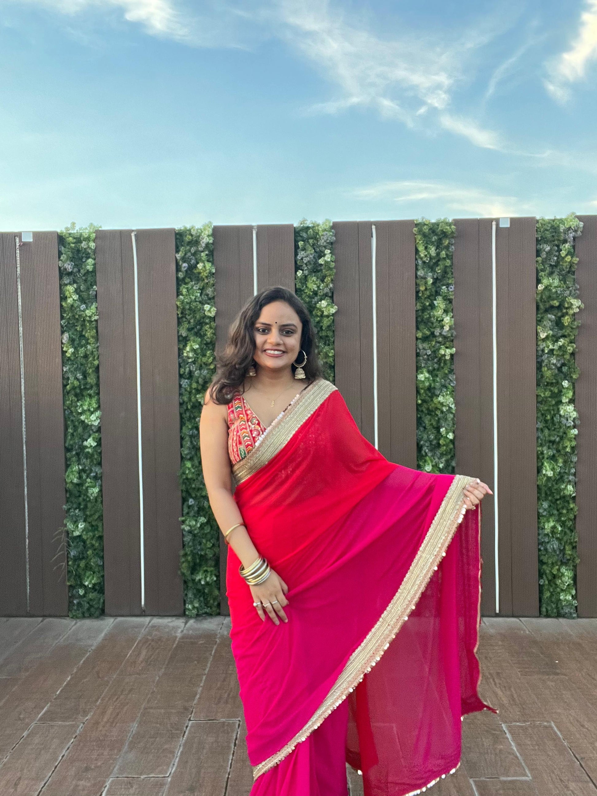- Red-Pink ombrè Chiffon saree with intricate lace work on pallu and border