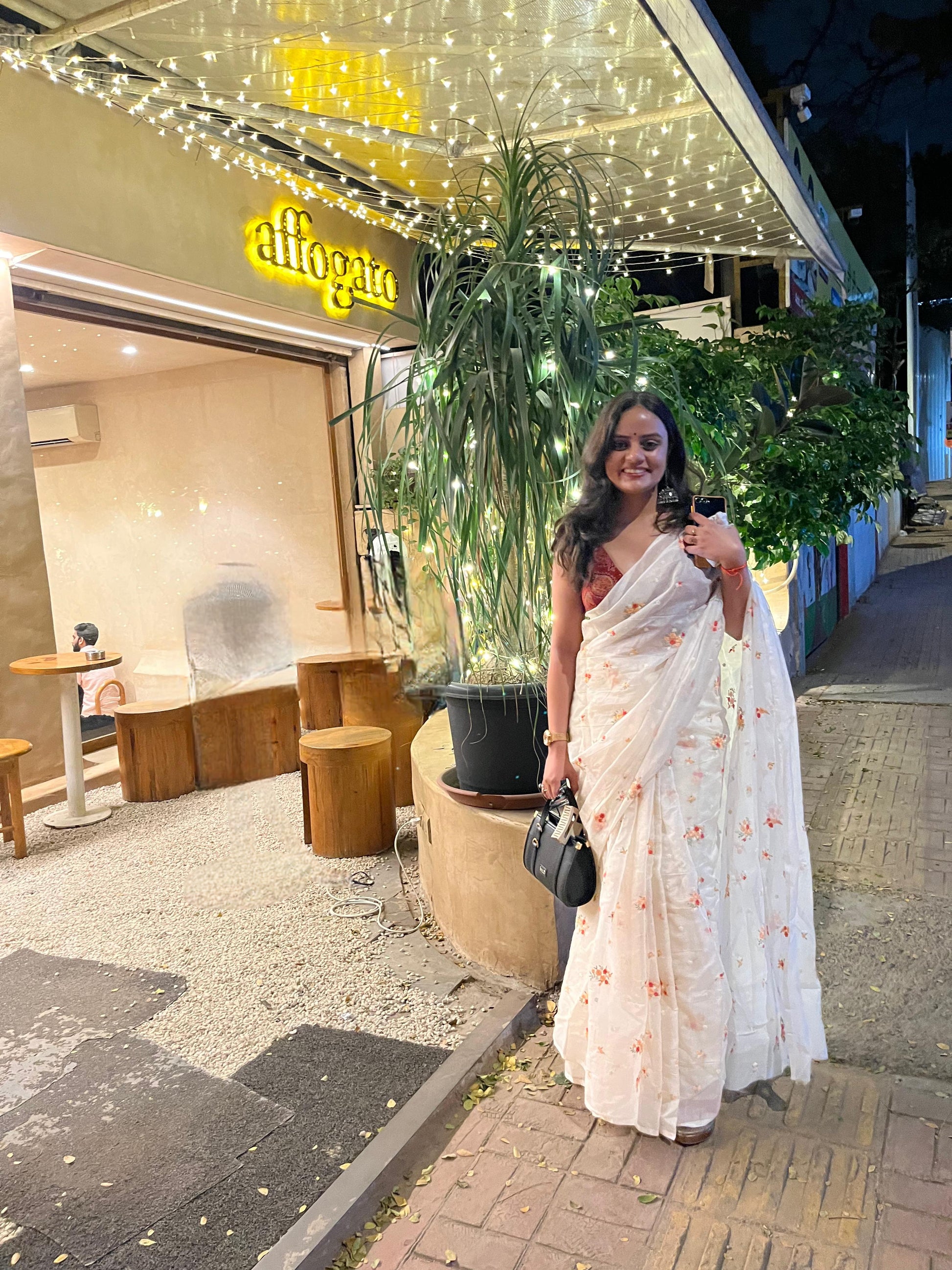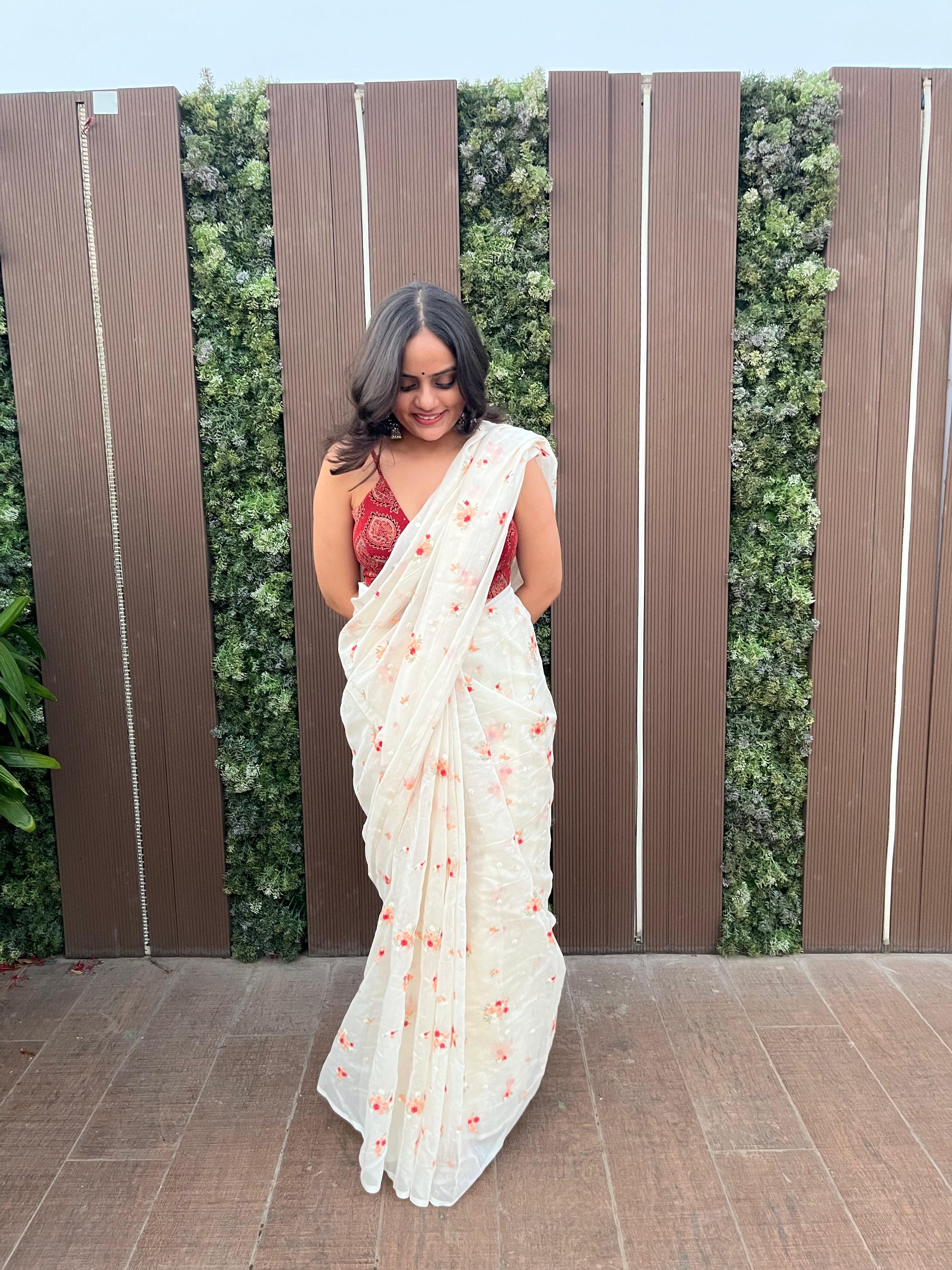 Crafted in airy Mul Chanderi, this pristine white saree is delicately embroidered all over with soft red and pastel florals - subtle enough for long office hours, yet graceful enough for daytime gatherings.