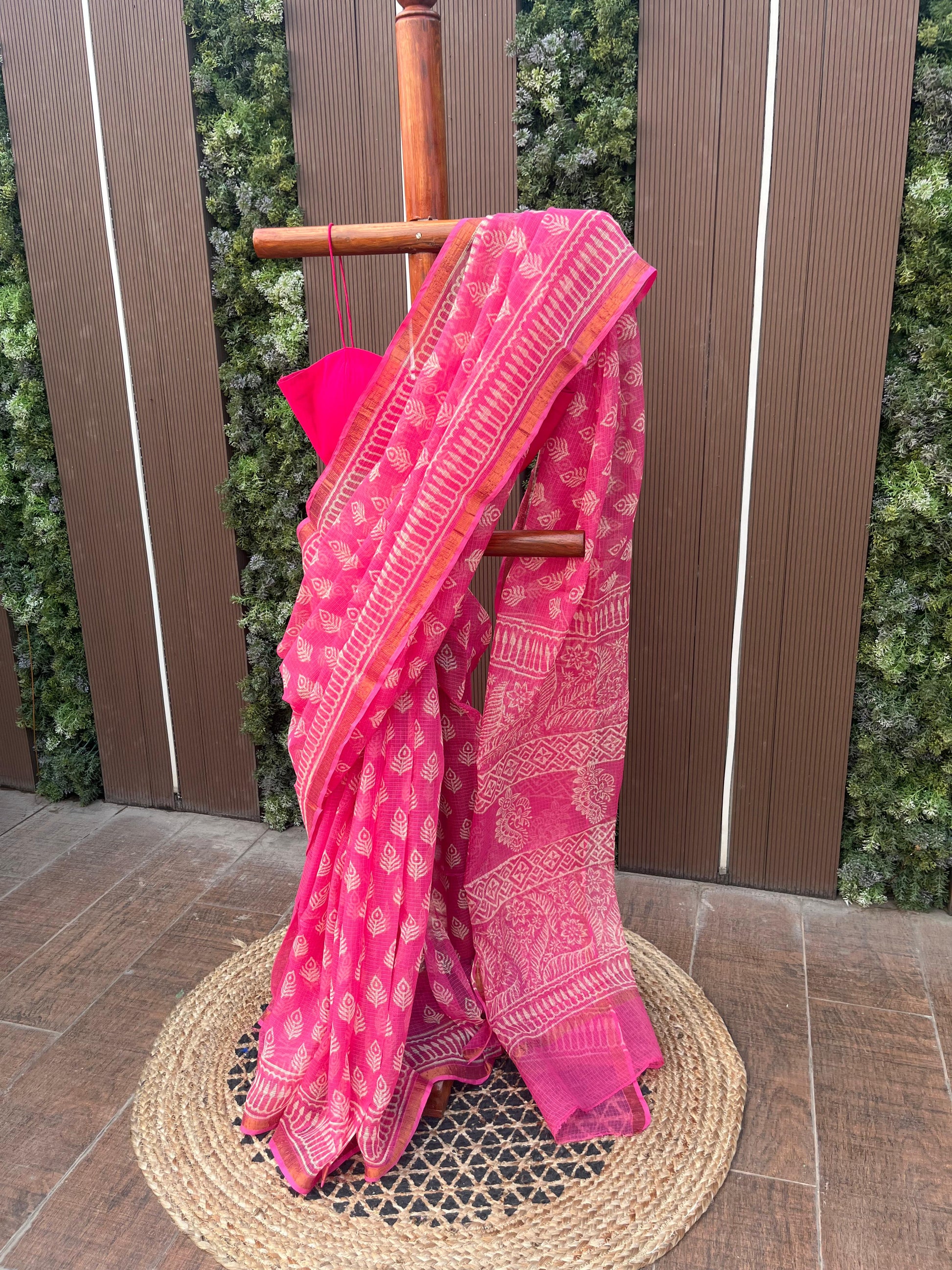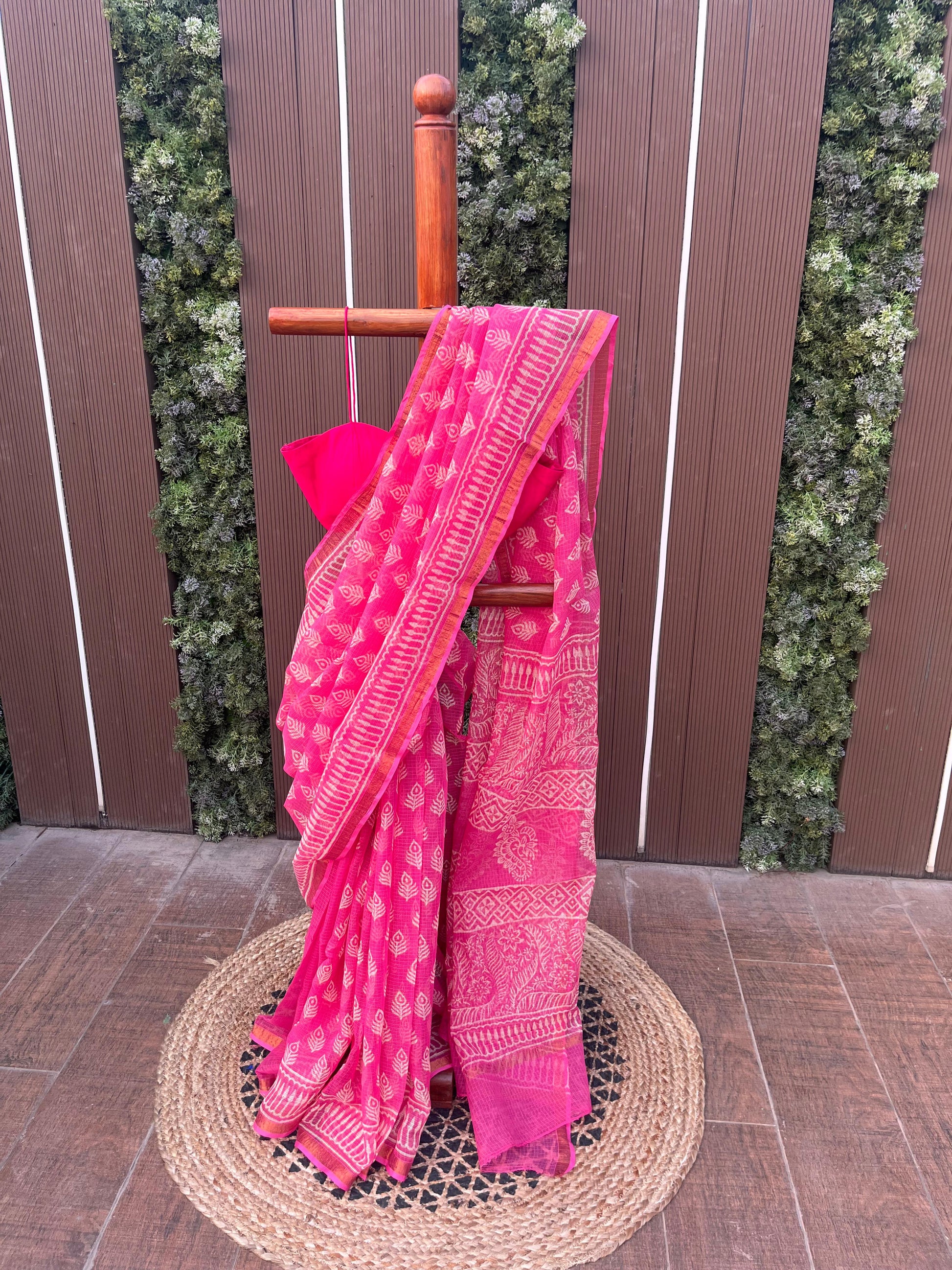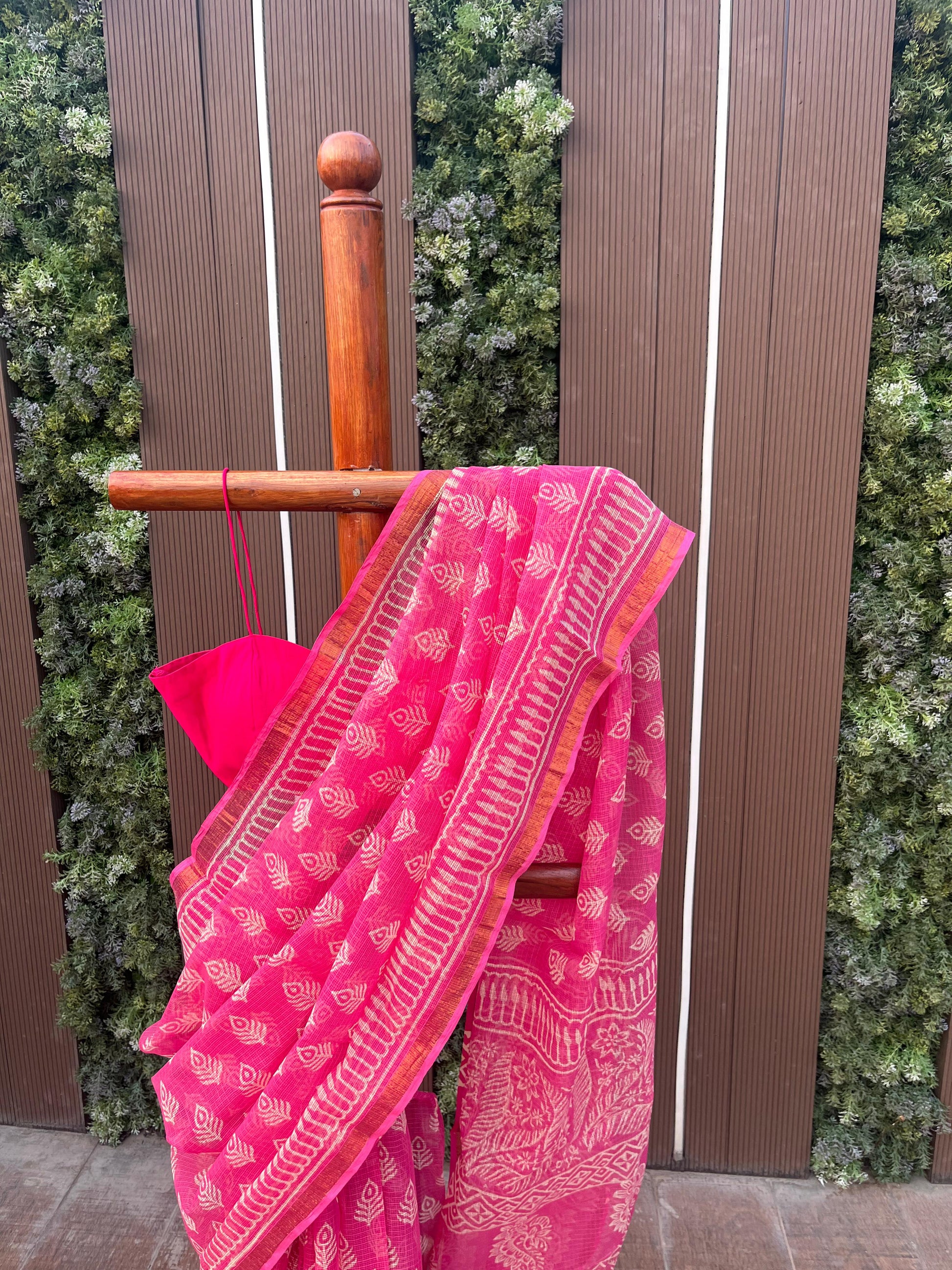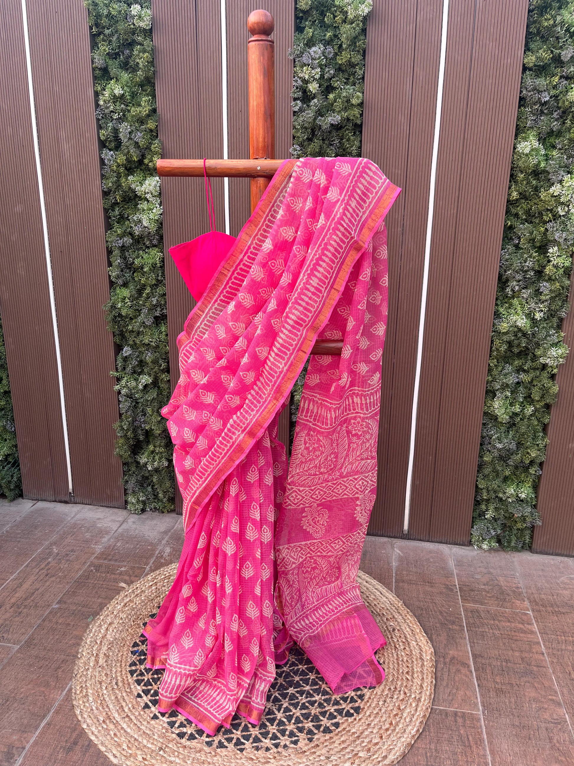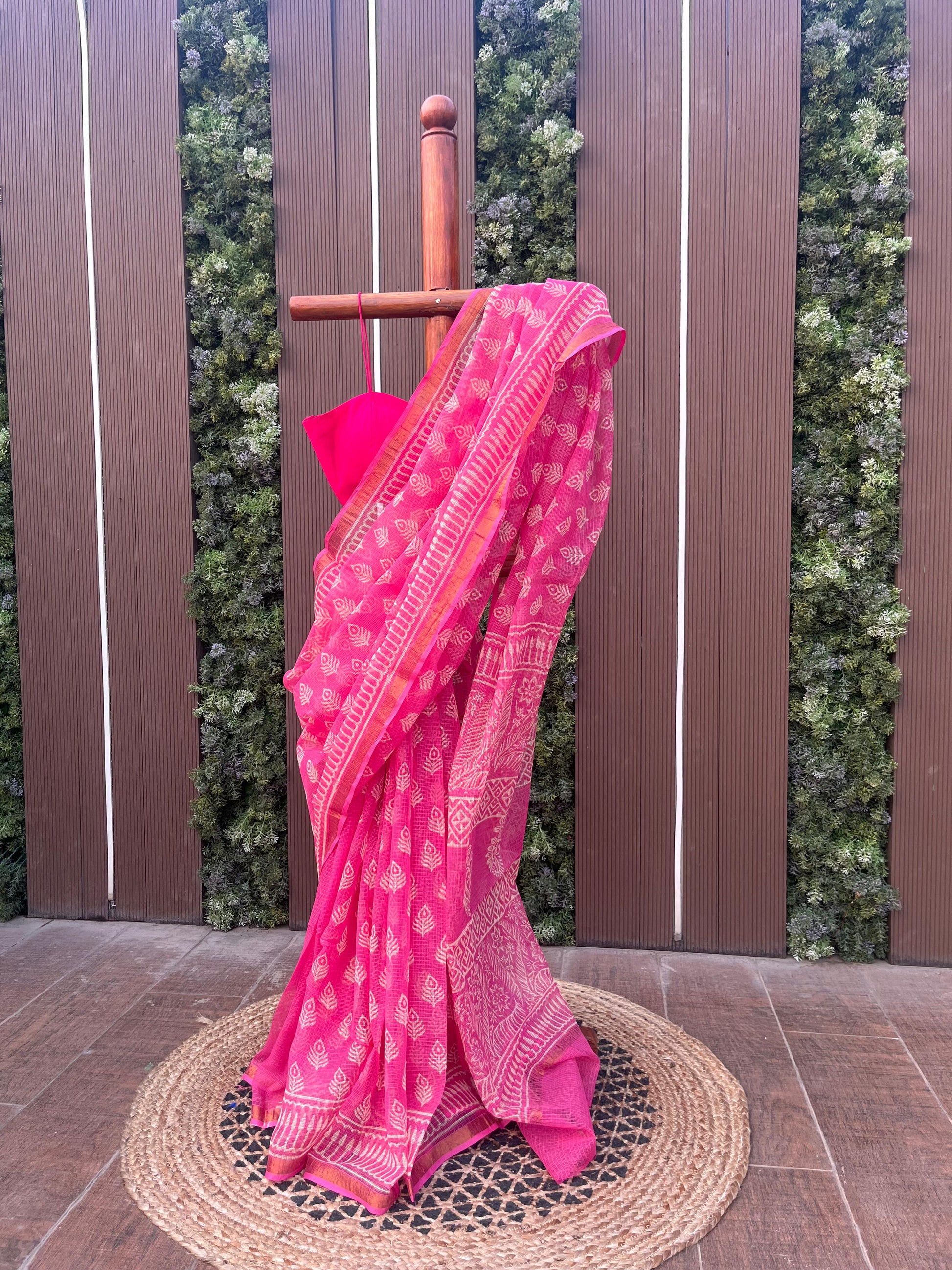 Crafted in pure Kota Doria, this light pink saree is adorned with delicate Bagru–Sanganeri prints, celebrating centuries-old hand-printing traditions in the lightest, most breathable drape.