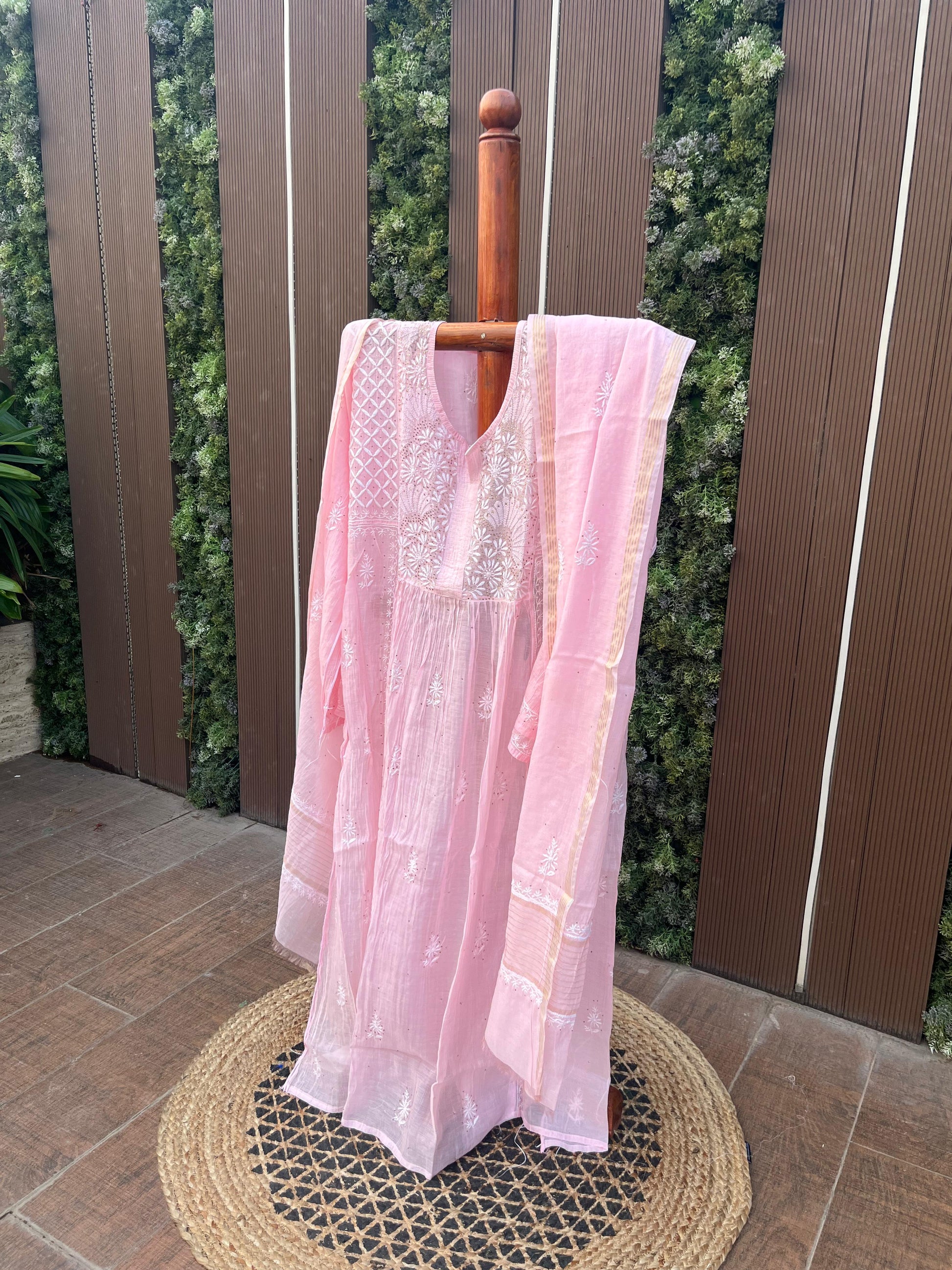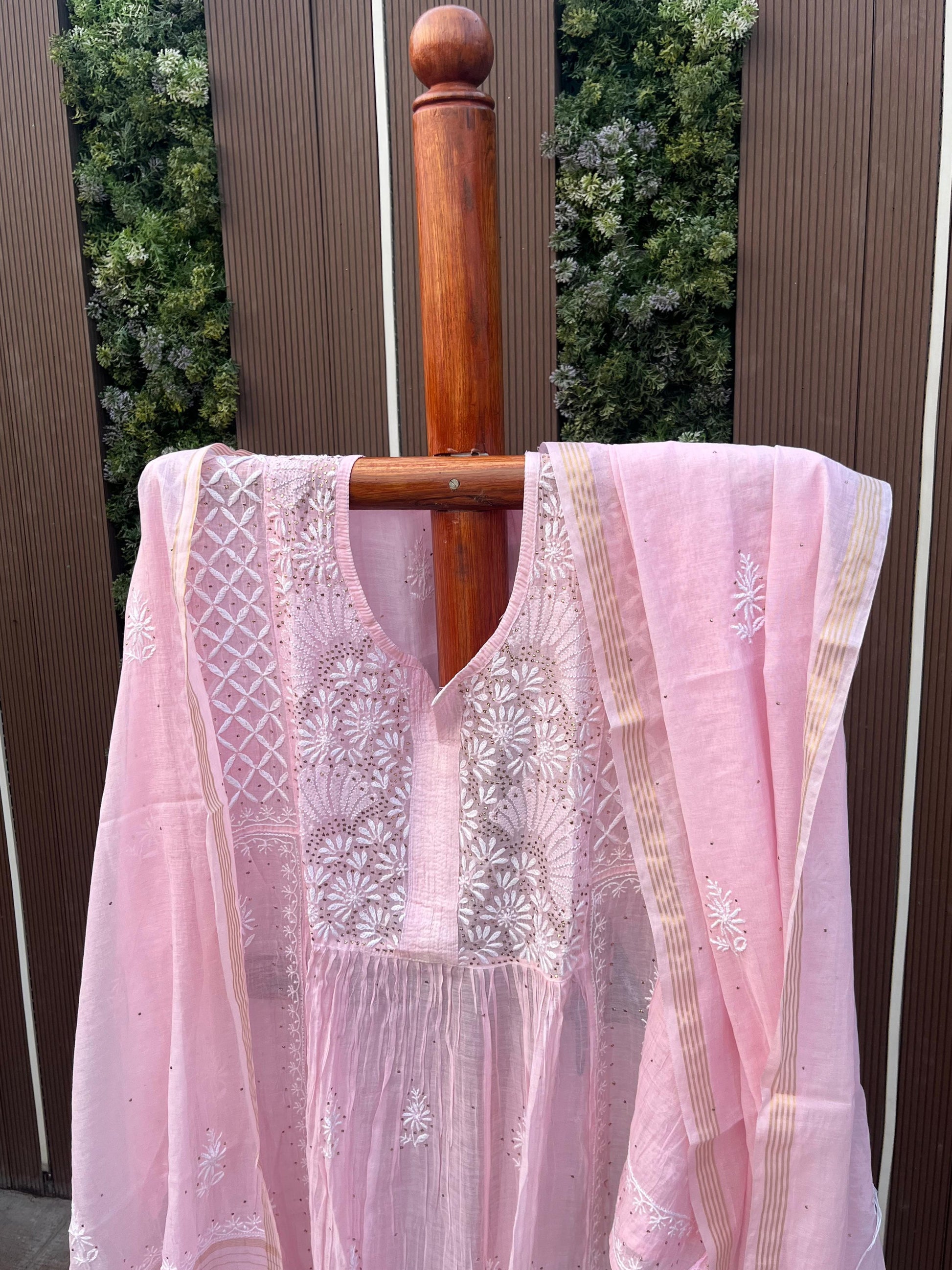 Pure Mulmul Chanderi Kurta Dupatta Set in elegant Pink Blush shade is handcrafted in an ultra-soft, breathable fabric, making it ideal for festive and everyday ethnic wear.