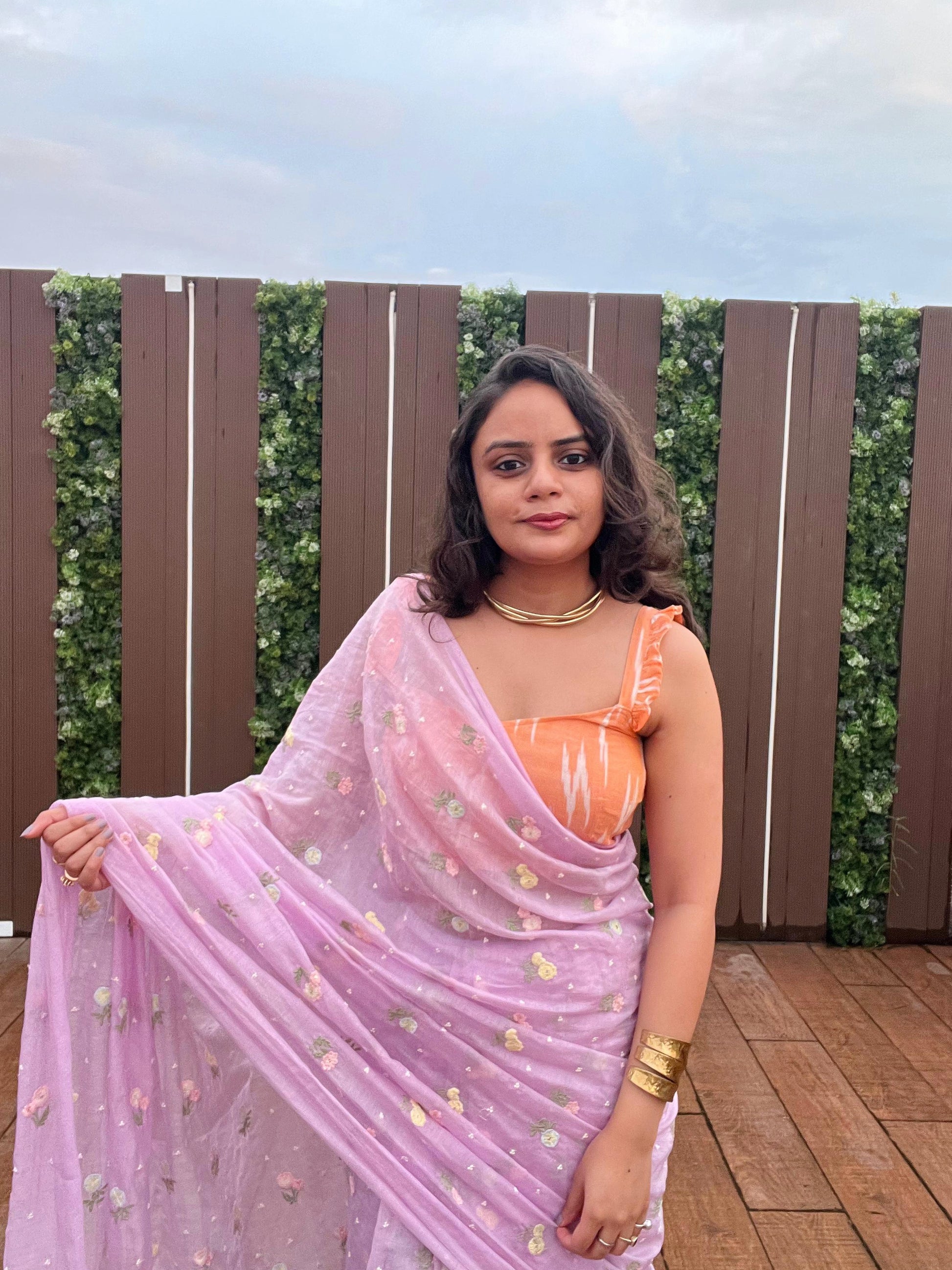- Lilac Mul Chanderi Saree with embroidered flower Buta