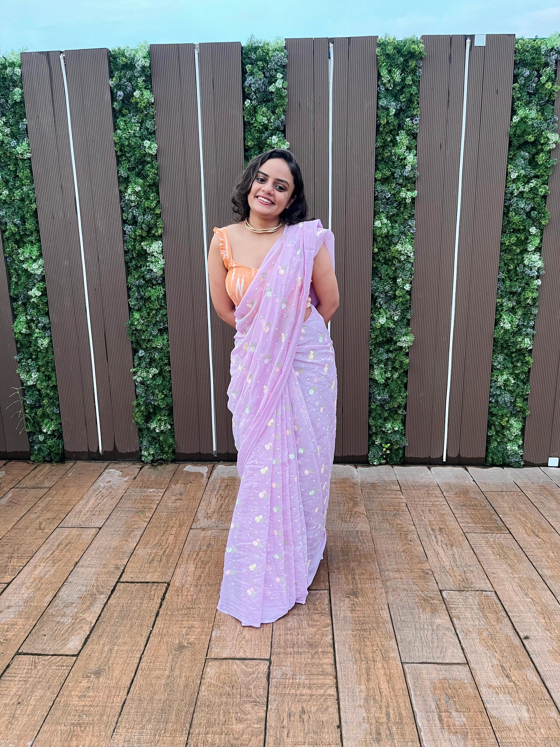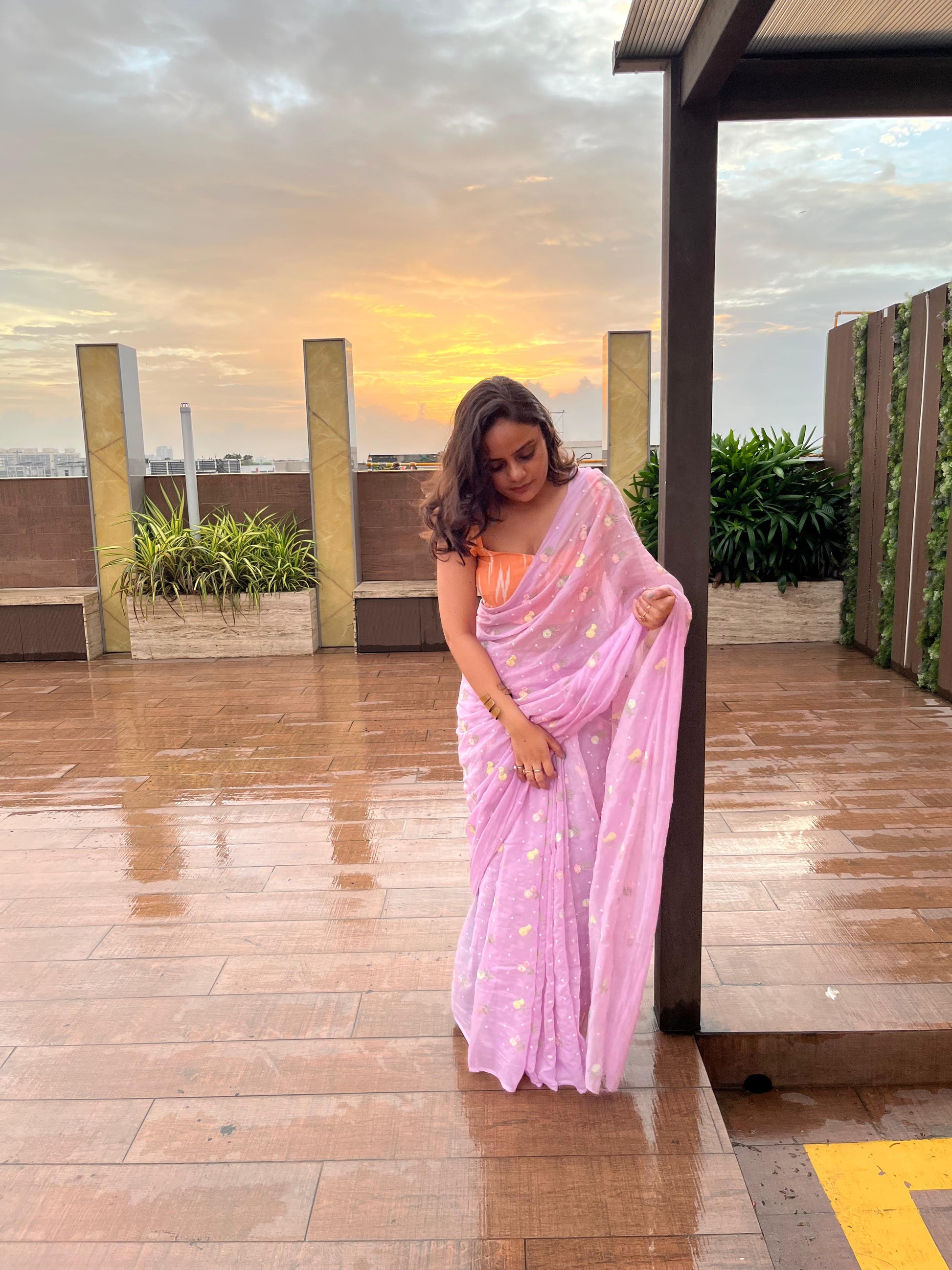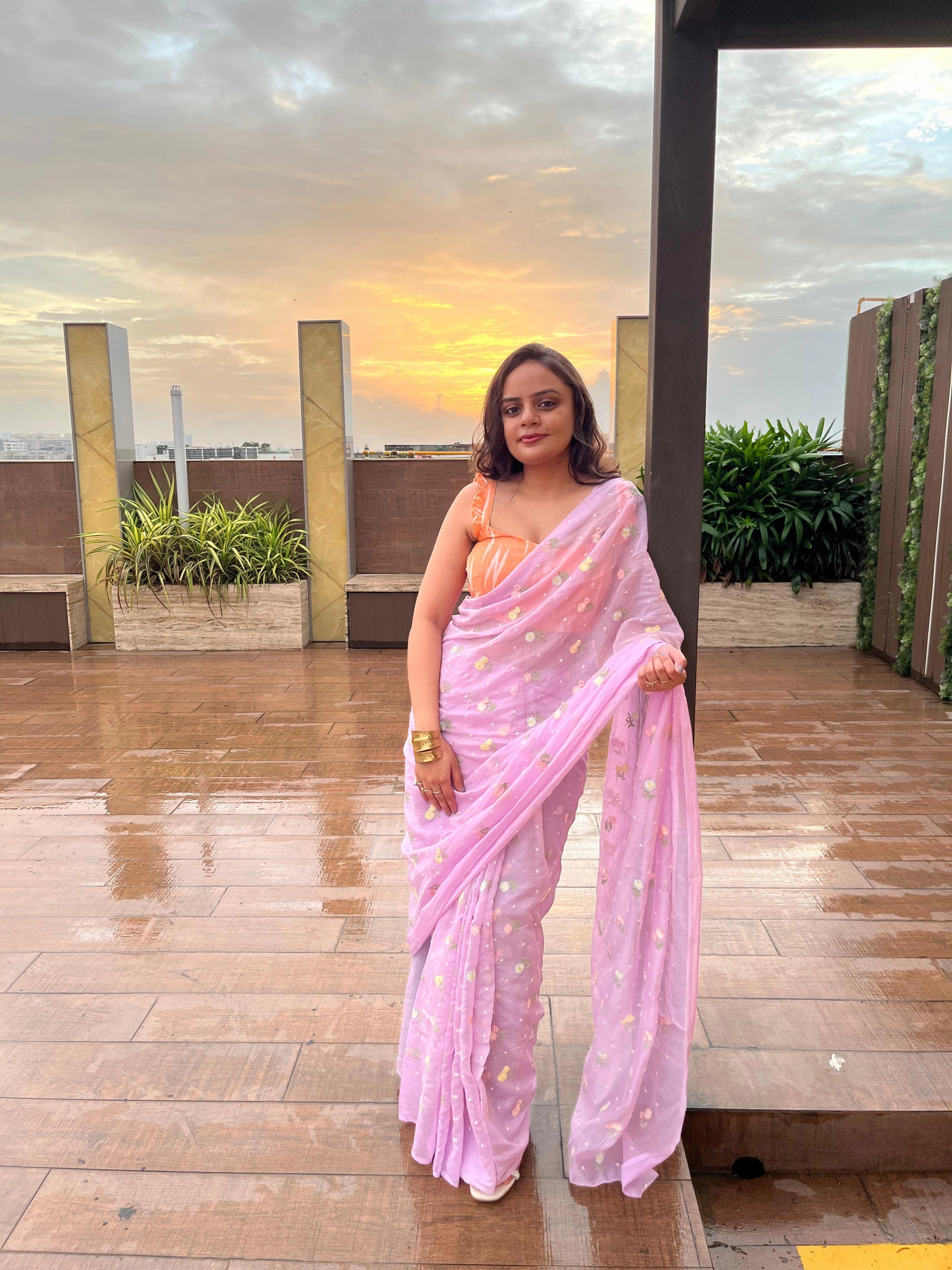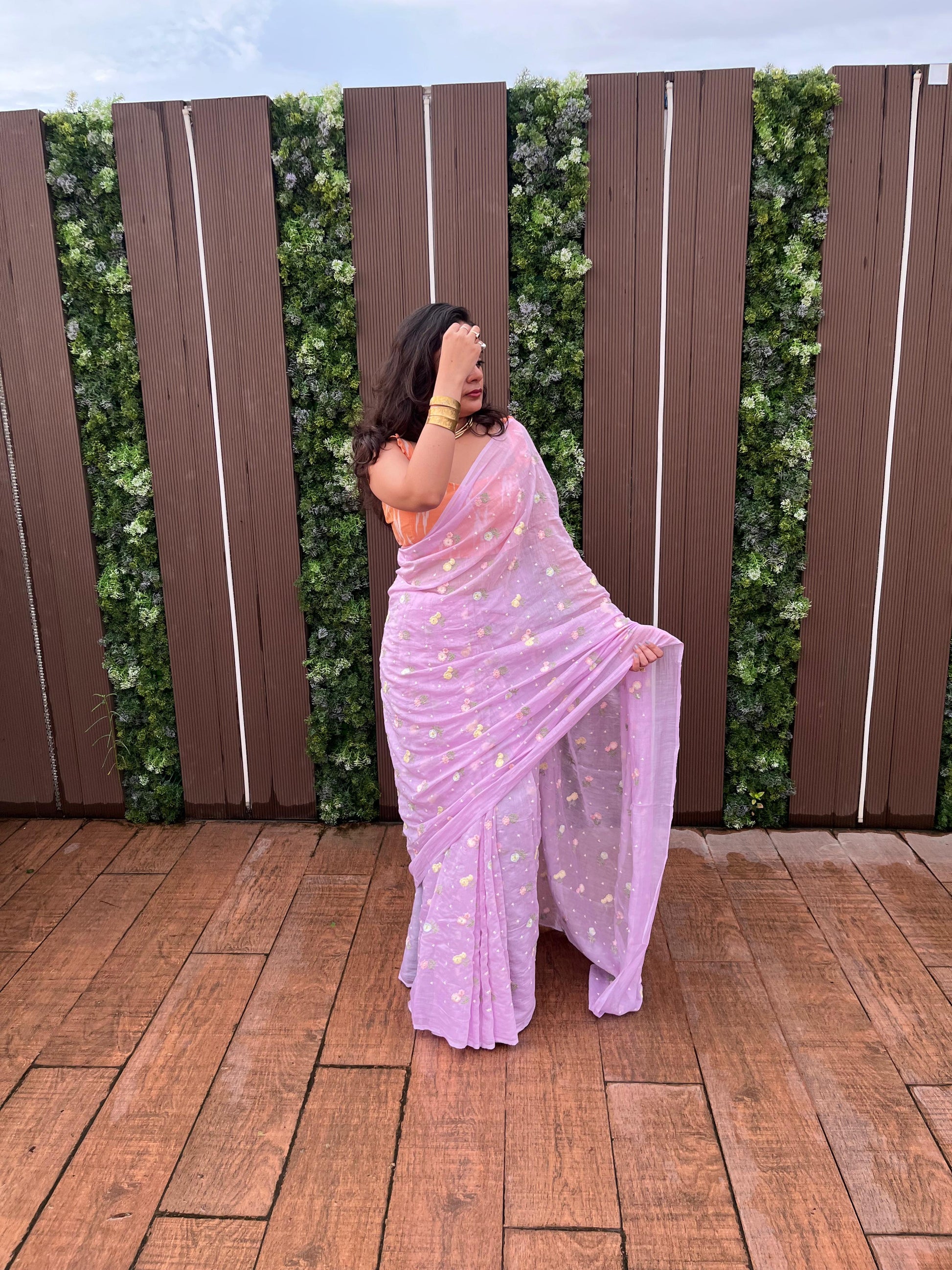 Lilac Mul Chanderi saree with intricate embroidered flower butas all over