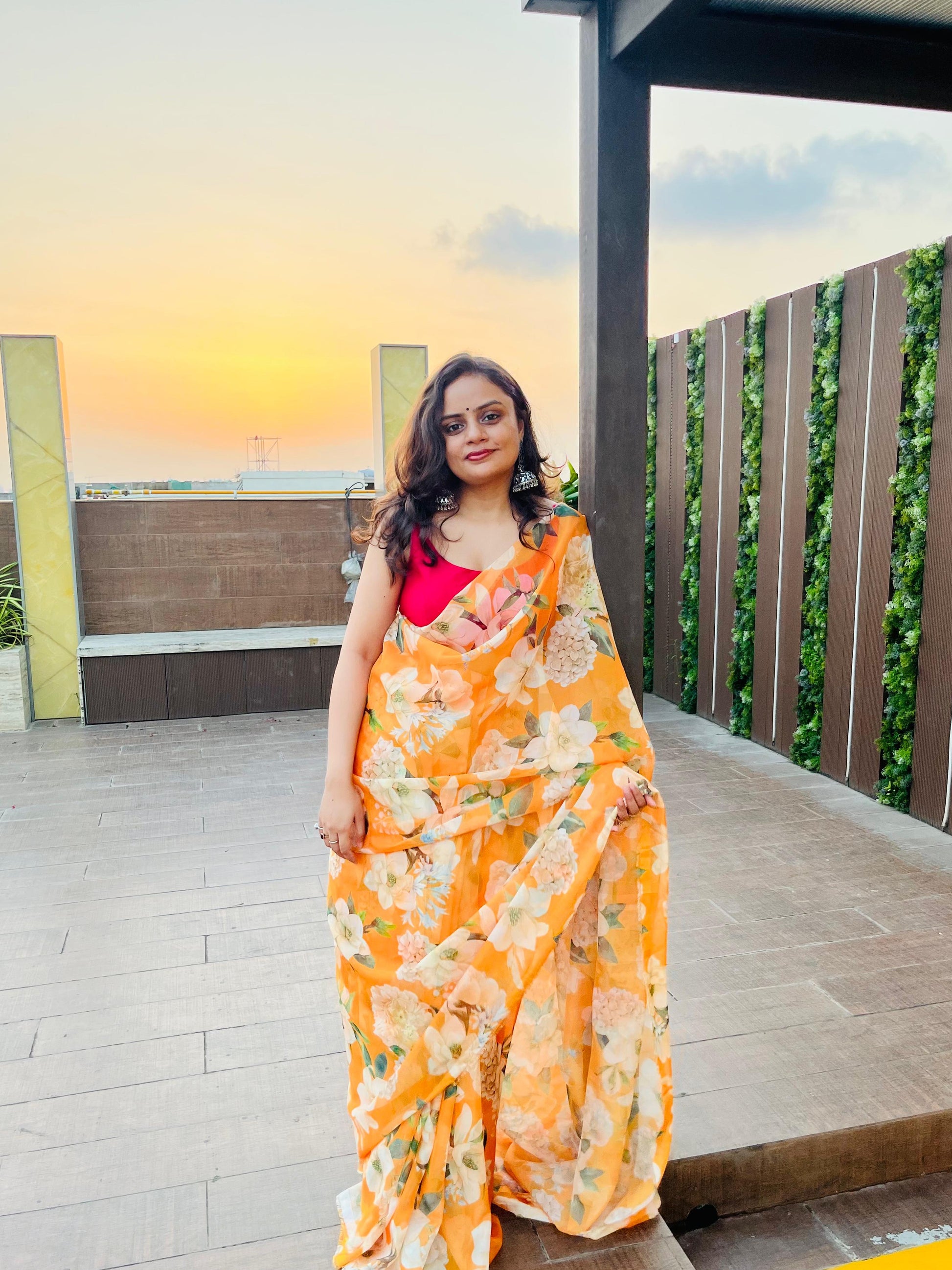 - Organza printed with bright tangerine florals
