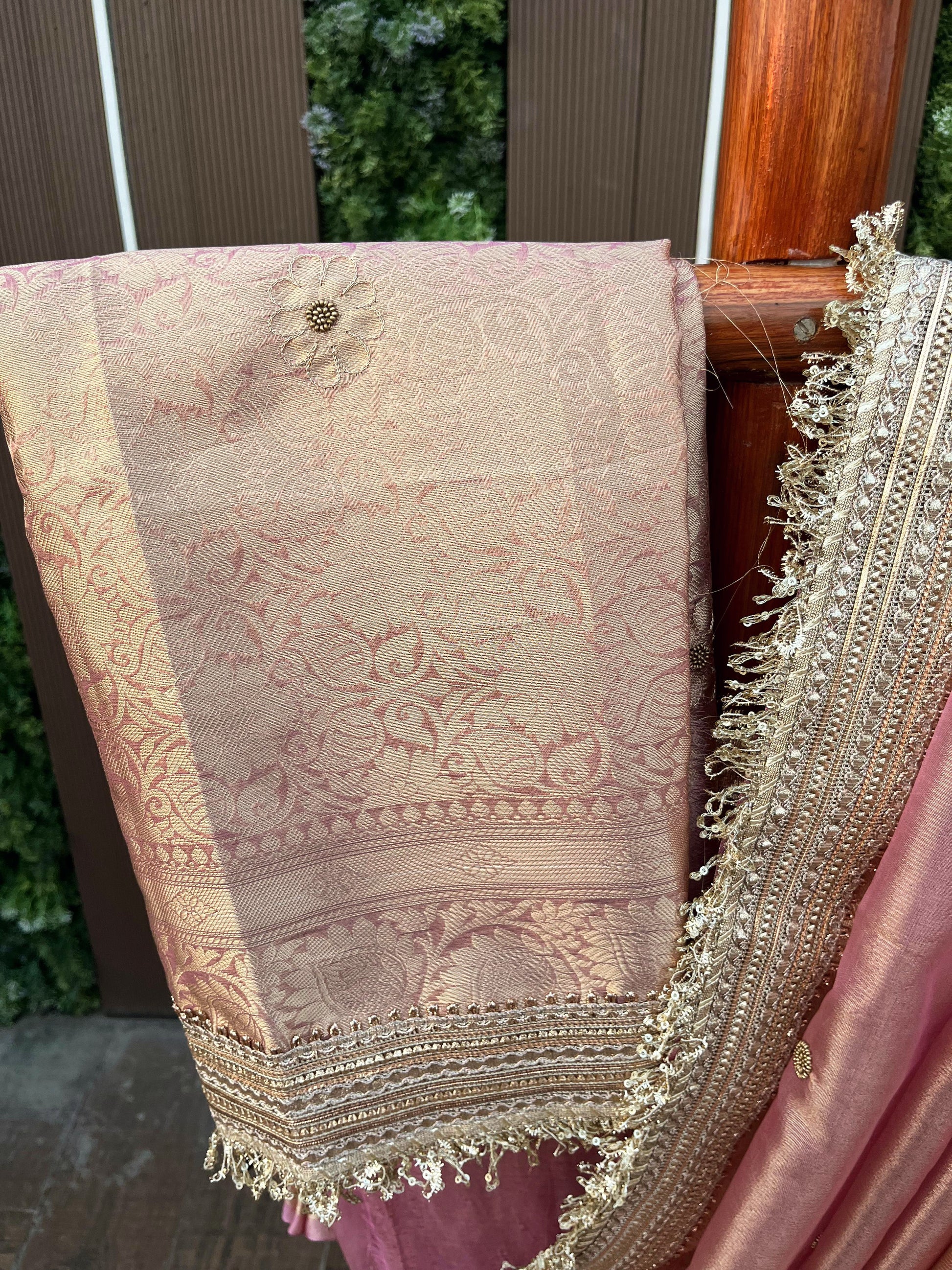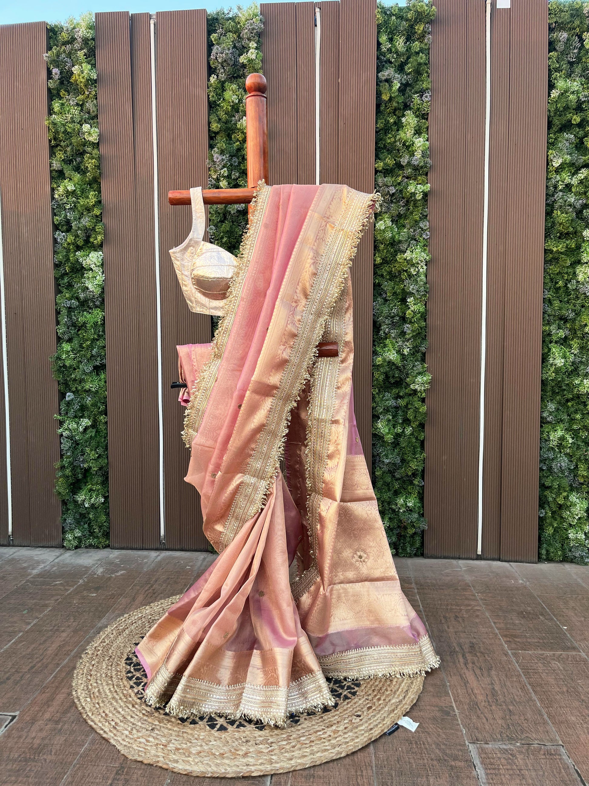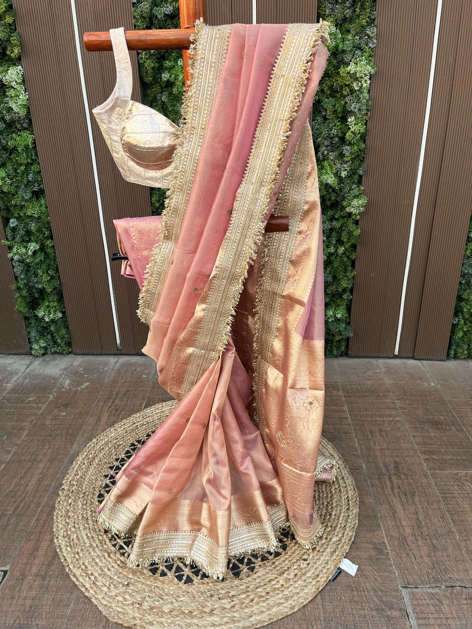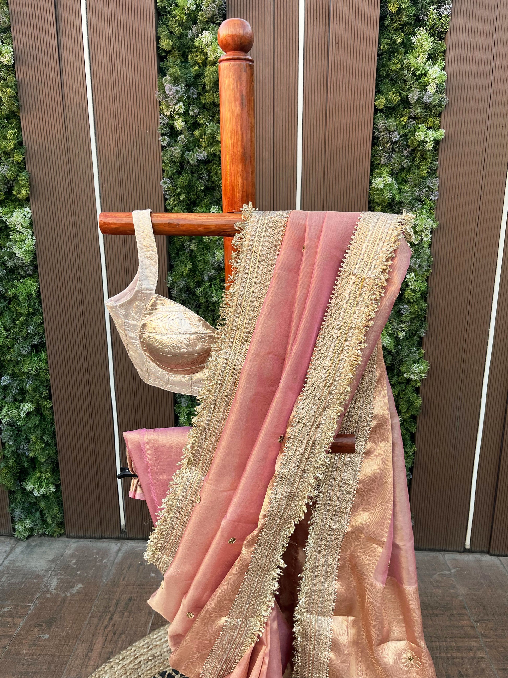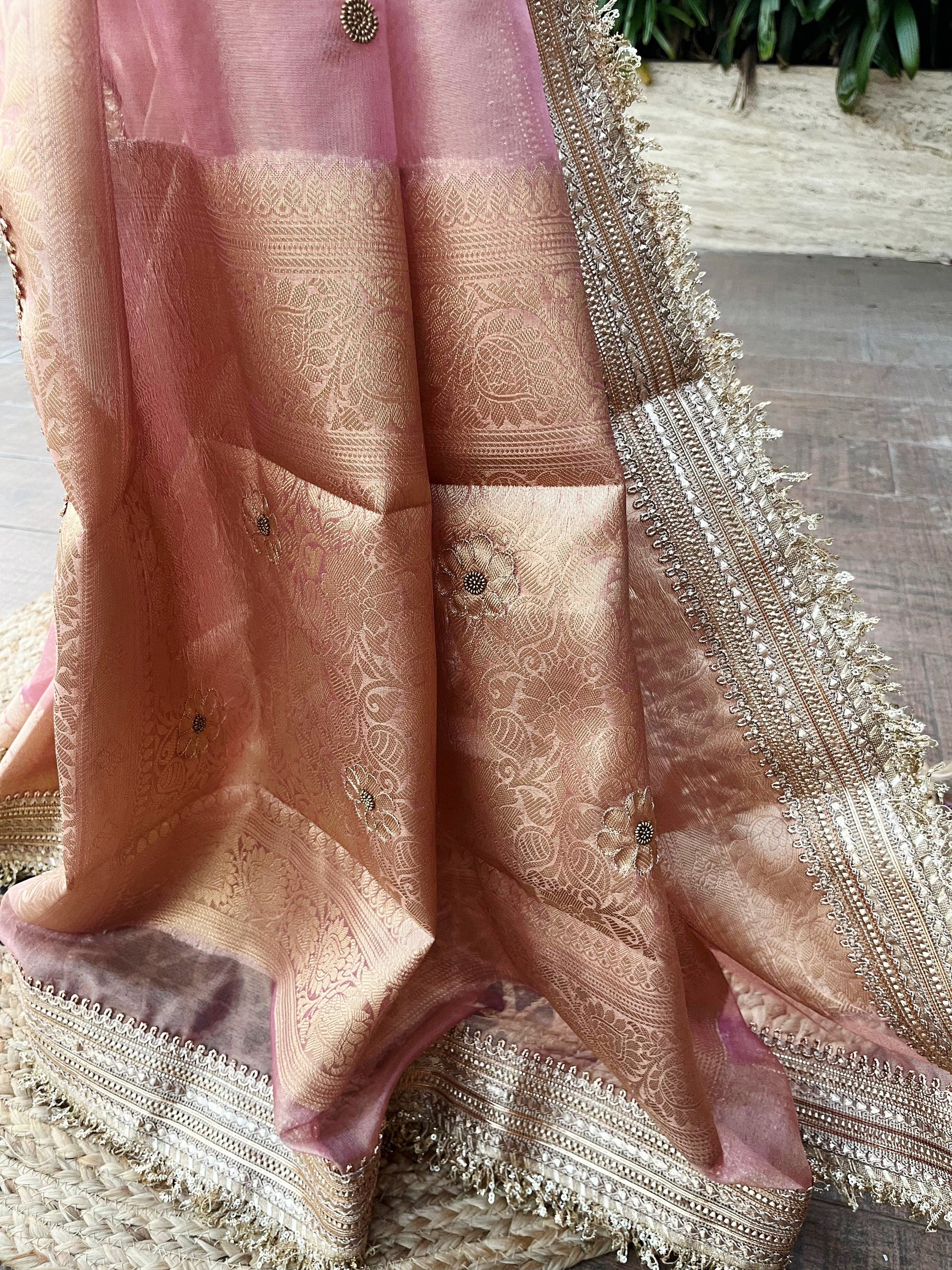 - Onion Pink Tissue Silk Banarasi saree with handwork flower buta and heavy zari and Maharani-style lace work on the pallu and border