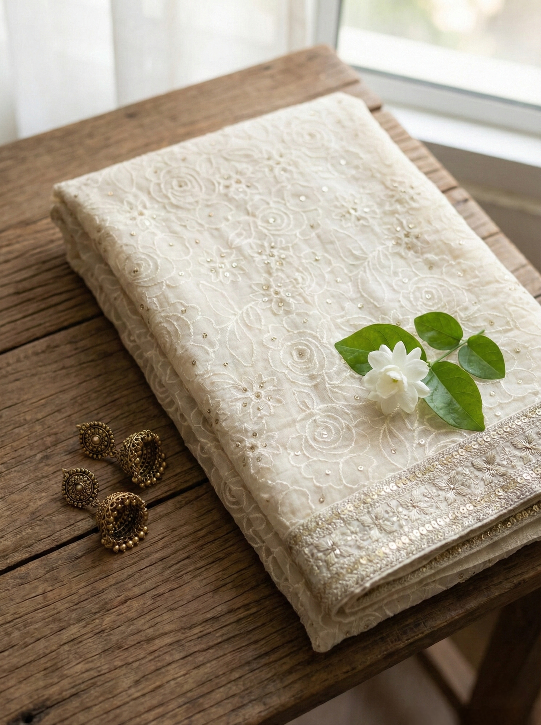 Its soft ivory base and delicate detailing make it a versatile luxury saree for women who appreciate understated opulence and heirloom-worthy craftsmanship.